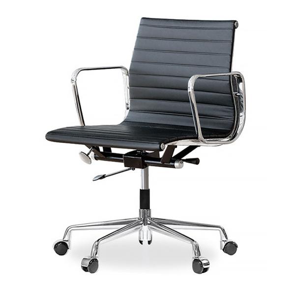 [サイズ]キャスター仕様:W66x D65x H101-111(cm):SH41-51 AH63-73(cm)重量 約13.8kg[素材]座面:本革脚部:アルミニウムダイキャスト クロームメッキプレスライン仕様[カラー]レザーブラック[生産国]中国[商品説明]ミッドセンチュリーを代表するチャールズ & レイ・イームズのアルミナム オフィスチェアです。当時の製品は、チルト機構(前後に傾く)のみでしたが、E-comfortの製品では、高さ調節機能がついて更に使いやすくなっています。チャールズ・イームズがラウンジチェアを期に、重量を軽減する為のアルミニウムを採用し、安定性を向上させるため5本足のデザインを取り入れましたが、この頃にアルミダイキャスト大量生産技術の開発され、実現した製品なのです。頑なに当時のオリジナル性を追求すること、新しい機能を加えてデザインを壊さないようにリプロダクションすること、どちらもジェネリックの有り方です。弊社は、現代の利用状況に合わせた家具作りを目指します。[送料]全国一律無料 (沖縄・離島は配達不可)[備考]※在庫管理には細心の注意を払い管理致しておりますが出荷までに