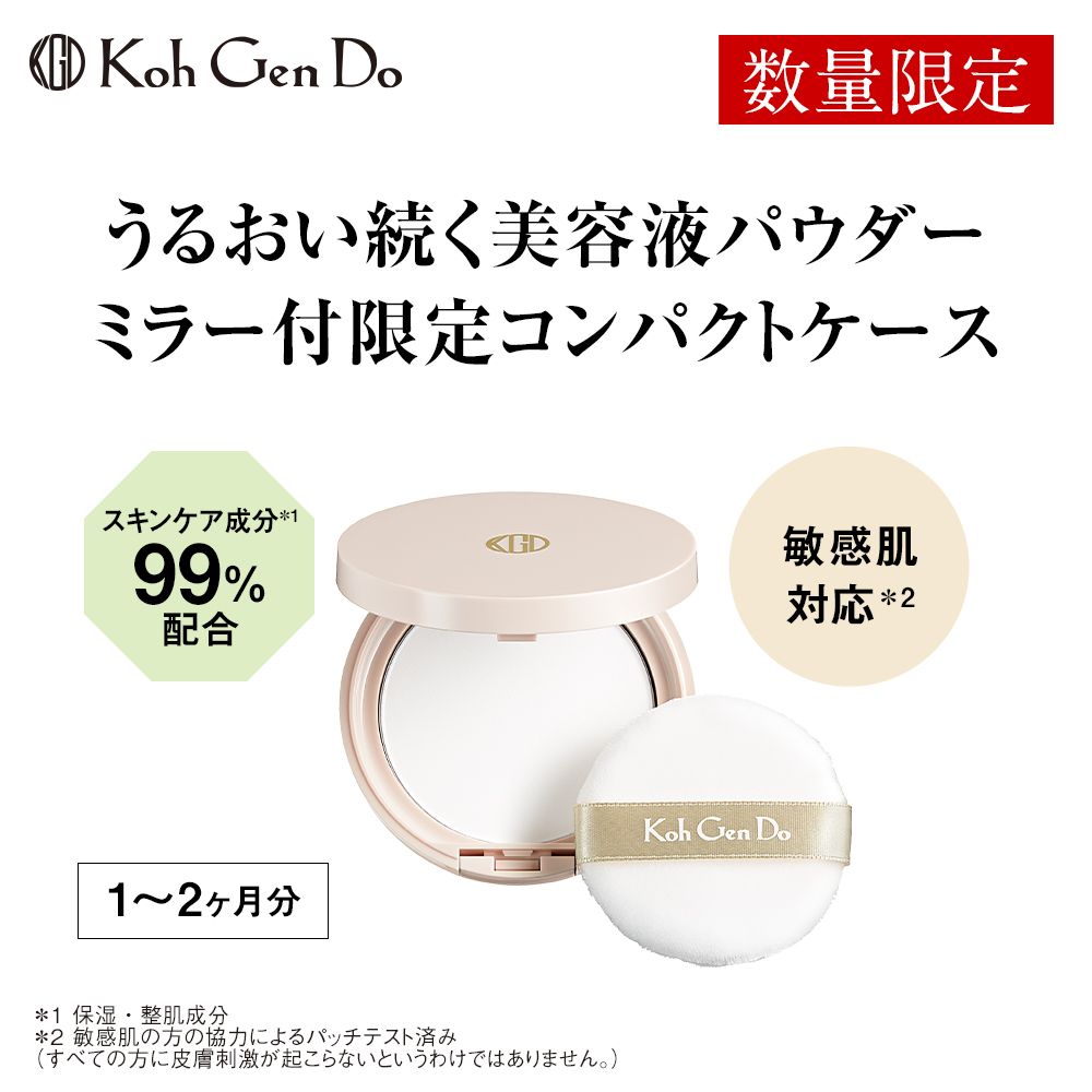 厳選したスキンケア成分を全体の99%配合(保湿・整肌成分)。昼も夜も使えて人気の保湿フェイスパウダーが、携帯しやすいミラー付コンパクトタイプで登場しました。メイク下地として、またはメイクの仕上げや化粧直しに使えば、まるで薄いヴェールをまとったような美肌を演出。素肌で過ごしたい日の保湿 & 美肌対策としてもスキンケア感覚で使えます。きめ細かなパウダーが過剰な皮脂を吸着し、気になる毛穴や肌の凹凸をカバー。シルクのようなやわらかな質感で、肌にすっとなじみ保湿感をキープします。コンパクトは外出先でのメイク直しに便利な鏡付き。定番品より薄い設計で、パフも厚みを抑えたものをセットしています。数量限定アイテムなので、気になる方はお早めに江原道1986年に東京・麻布十番で誕生した江原道は、当初から一貫して「肌へのやさしさ」と「機能性」を融合させた自然派化粧品を開発。素肌を主役におきながらも高いカバー力を誇るファンデーションやすこやかな肌へ導くスキンケアアイテムは、映像業界でも高く評価され国内外の映画・ドラマ・舞台で使用されています。