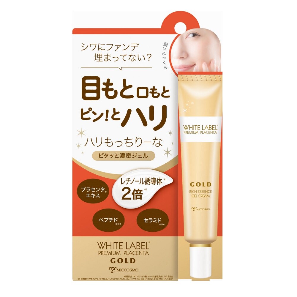 ロングセラー「ホワイトラベル 金のプラセンタ濃シワトール」がパワーアップしてリニューアルしました!塗った瞬間、もっちりとした濃密ジェルが細かいシワにもピタっと密着。ソフトラップ効果(*)でピンっとしたハリ感を与えるアイジェルクリームです。レチノール誘導体(※1)を従来品より2倍(当社比)配合し、ナイアシンアミド(※)と、2種類のペプチド(※2)、プラセンタエキス(※)を配合。乾燥によるハリ不足が気になる肌をたっぷり保湿して、肌のキメを整えます。* 物理的効果 ※ 保湿成分※1 パルミチン酸レチノール(保湿成分)※2 ジ酢酸ジペプチドジアミノブチロイルベンジルアミド、パルミトイルトリペプチド-5(保湿成分)