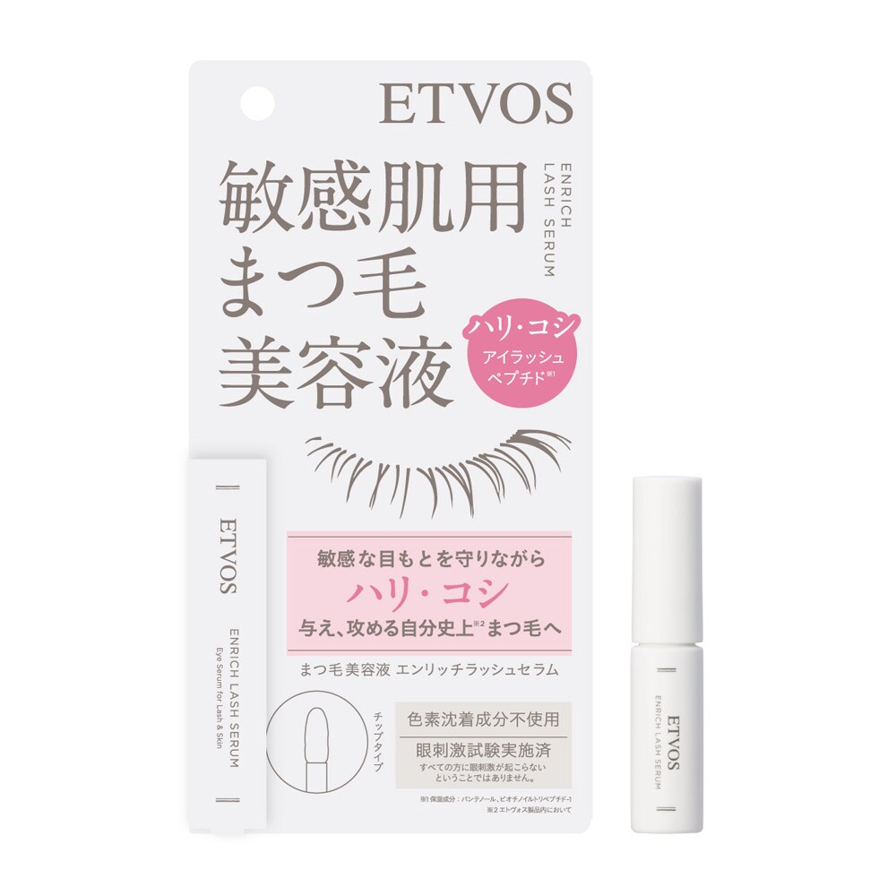 美容液成分97%(※)配合で、敏感な目もとをいたわりつつ、まつ毛にハリ・コシをプラス。地肌にもうるおいを与える「攻める & まもる」でWケアするまつ毛美容液です。液含みの良いチップは、やわらかく先端が細くなっていて細かな部分にも塗りやすい。また、セラムは適度な粘度でまつ毛に絡みやすく、しっかり密着。使いやすさとやさしさにこだわったつくりです。まつエク・まつパをしているまつ毛、眉毛にも使用OK。朝・晩の洗顔後、清潔な目もとにご使用ください。※ 美容液成分の配合目的:保湿成分、整肌成分、水ETVOS(エトヴォス)クチコミでも大人気のスキンケア発想の国産ミネラルコスメ。基礎力に着目したスキンケア、軽いつけ心地とクレンジング不要で肌への負担を考えたミネラルメイクできれいを呼び覚ましてくれます。