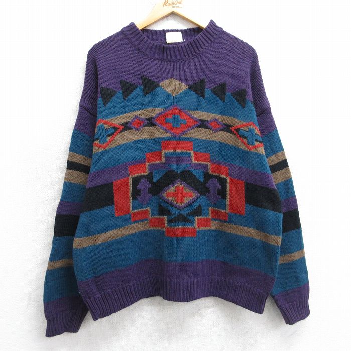 ■古着 長袖 セーター メンズ 90年代 90s ネイティブ柄 ラグ柄 モックネック ハイネック 紫他 25nov13