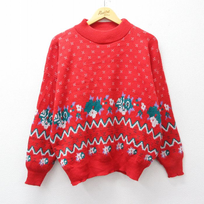 ■古着 長袖 セーター メンズ 90年代 90s 雪柄 大きいサイズ アクリル モックネック ハイネック USA製 赤 25nov14