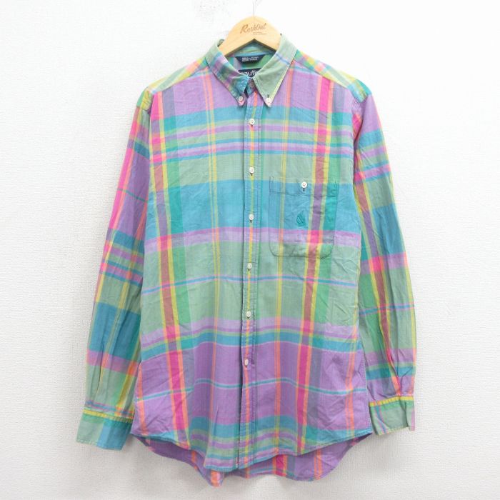 ■古着 ノーティカ 長袖 ブランド シャツ メンズ 90年代 90s ワンポイントロゴ コットン ボタンダウン 緑他 チェック 25nov19
