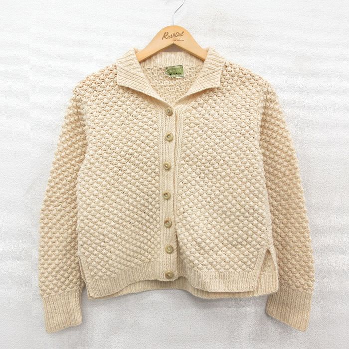 ■古着 長袖 ニット カーディガン レディース 80年代 80s 手編み ハンドニット ウール アイルランド製 生成り 25nov22