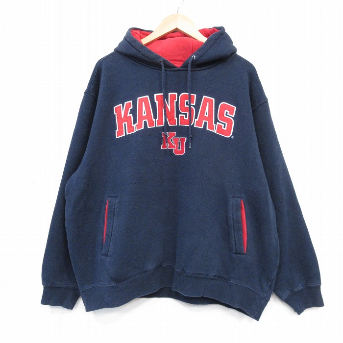 ■古着 長袖 スウェット パーカー メンズ 00年代 00s カンザス 刺繍 大きいサイズ 紺 25nov15