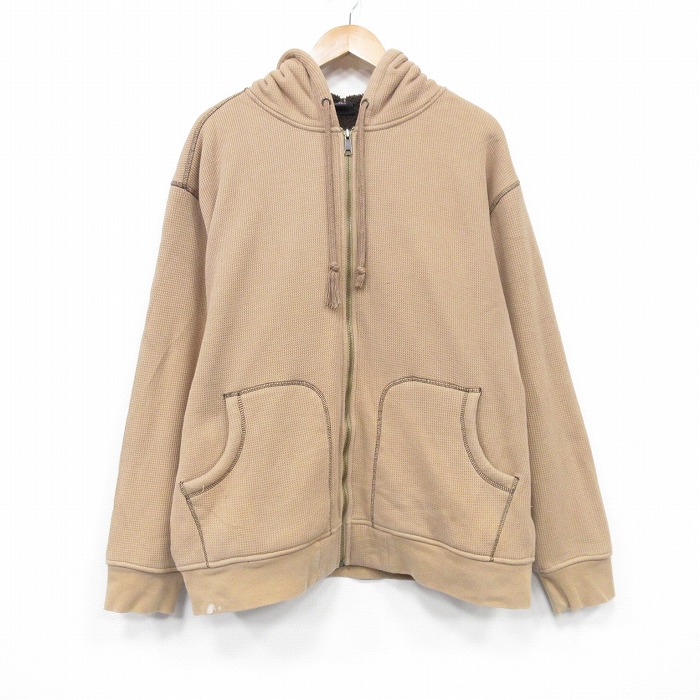 ■古着 ヘインズ 長袖 フルジップ スウェット パーカー メンズ 大きいサイズ サーマル地 コットン ベージュ 25nov12