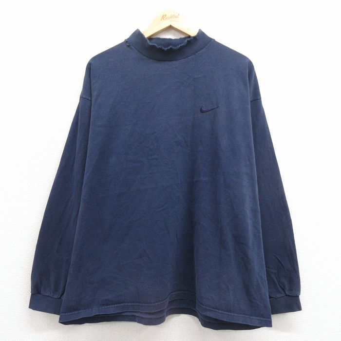 ■古着 ナイキ NIKE 長袖 ビンテージ Tシャツ メンズ 90年代 90s ワンポイントロゴ 大きいサイズ モックネック ハイネック USA製 紺 25nov1
