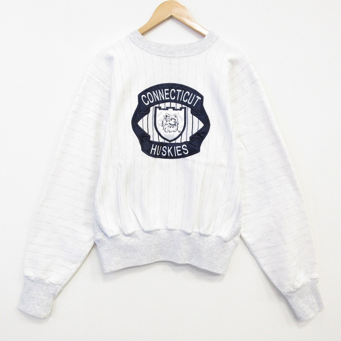 ■古着 長袖 スウェット メンズ 90年代 90s コネチカットハスキーズ 刺繍 クルーネック 白 ストライプ 25nov17