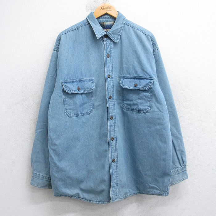 ■古着 長袖 シャツ メンズ ロング丈 コットン 薄紺 デニム 内側フリース 25nov15