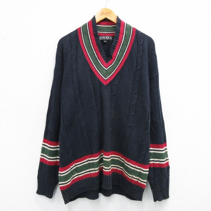 ■古着 ペリーエリス 長袖 ケーブル チルデン セーター メンズ 00年代 00s 大きいサイズ Vネック 濃紺他 25nov15