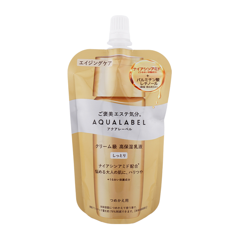 JAN 4909978199463 【商品説明】 ナイアシンアミド(うるおい保護成分)配合。悩める大人の肌に、ハリつや。真珠のように艶めくベールで、ふんわり密封。 もちっとハリつや溢れる肌へ、クリーム級 高保湿エイジングケア*乳液。乾燥小ジワを目立たなくする(効能評価試験済み)。 *年齢を重ねた肌にうるおいを与えるケア ※こちらの商品は詰め替えのため、ボトルは付属いたしません。 ※パッケージは予告なく変更となる場合がございます。 【使用方法】 ●必ず、アクアレーベル トリートメントミルク (オイルイン) しっとりの本体容器につめかえてから、ご使用ください。 ●化粧水の後、手のひらに適量をとり、顔全体になじませます。 本体容器へのつめかえ方 (1)本体容器のキャップは下の部分を持ち、まわしてはずしておく。 (2)そそぎ口の付け根部分をしっかりおさえながらキャップをはずす。 (3)そそぎ口を本体容器に差し込み、そのままゆっくり中味を入れる。 (4)本体容器にキャップを差し込んで、しっかり閉める。