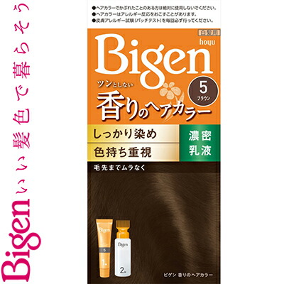 ビゲン 香りのヘアカラー 乳液 5- ブラウン 40g+60m L *医薬部外品 ホーユー/密着して染める/濃密乳液が生え際にくいつきとどまる/色持ち成分/染料の流出を抑え日にちが経っても髪色キレイ/ツンとしない/ほのかなアロマの香り/天然由来トリートメント成分 白髪染め 白髪隠し