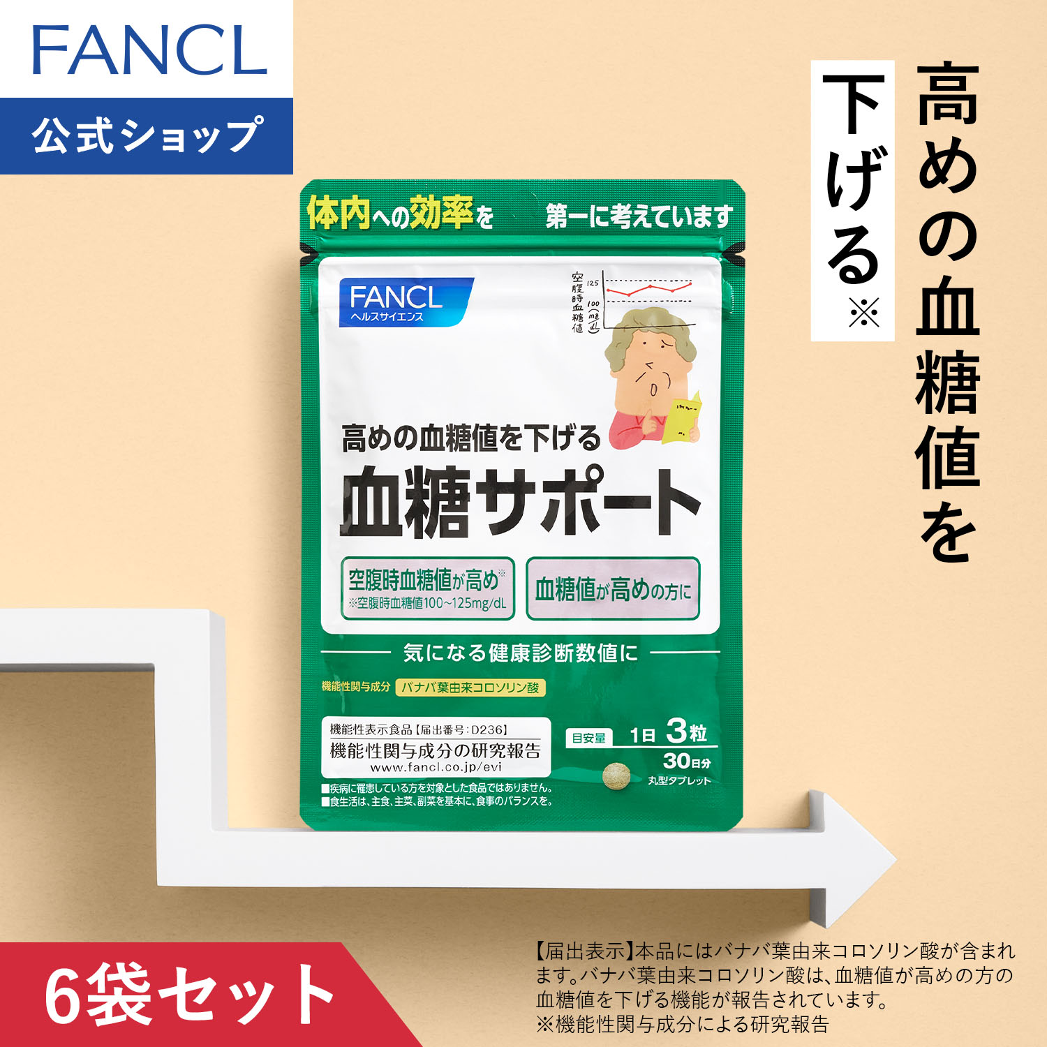 【パッケージ切替商品】お届けの時期によってパッケージが異なる場合がございます。 バナバ葉由来コロソリン酸を配合した、血糖値が高めの方の機能性表示食品です。高めの血糖値を下げる働きがあると報告されています。血糖値が高めの方は、食べる順番や食事の内容などに気をつけながら、サプリメントでも対策しましょう。 【届出表示】[届出番号:D236] 本品にはバナバ葉由来コロソリン酸が含まれます。 バナバ葉由来コロソリン酸は、血糖値が高めの方の血糖値を下げる機能が報告されています。 180日分 (30日分×6袋)