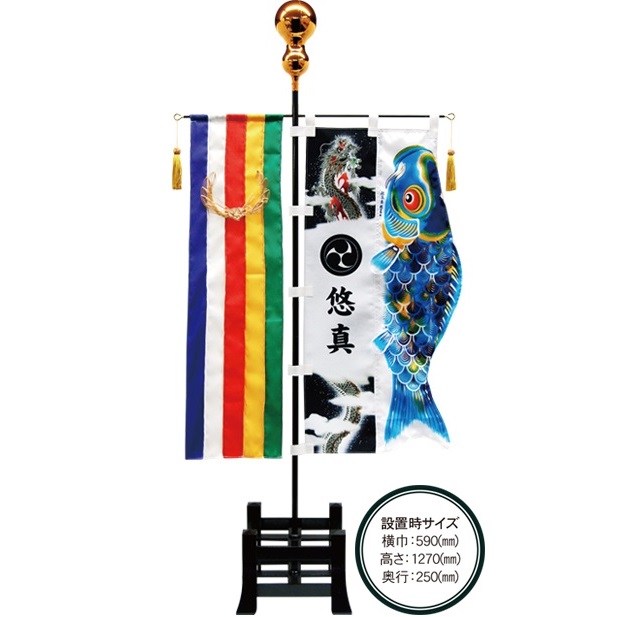 [徳永鯉]室内用[節句のぼり][室内飾りこいのぼり幟][登龍門]家紋・名前入り[154-040sk2][日本の伝統文化][五月人形]設置面サイズ:横巾590×高さ1270×奥行250mm◆全長:1.27m鯉のぼりと幟旗を組合わせた今までにない全く新しい節句幟!〜お子様の立身出世の願いを込めて〜五色幕水引き飾りには無病息災の意味が込められ勝利の印「月桂樹」をあしらいました。五月人形と共に飾って演出してください。また場所をとらない室内飾りですので、玄関やスペースの少ないお部屋など、室内飾りこいのぼり幟だけでもお飾りいただき、お祝いしていただけます。≪セット内容≫室内飾りこいのぼり幟(青鯉のみ)・五色幕金色房・黄金ひょうたん飾り台■一種の家紋又は花個紋と一人の名前(3文字迄)をお入れします。■名前入れの書体は「太楷書体」になります。受注後のお取消し返品不可でございます。制作に2週間程お時間を頂戴致しております。お入れするお名前の確認メールを差し上げます。ご確認出来ない場合は、ご注文をお受けすることが出来ませんので、悪しからずご了承いただきますようお願い申し上げます。【メール便不可】