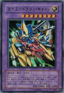 カード名:XYZ−ドラゴン・キャノン 収録:STRUCTURE DECK−海馬編− Volume.2 品番:SK2-042 レアリティ:ウルトラレア 融合・効果モンスター 星8/光属性/機械族/攻2800/守2600 「X−ヘッド・キャノン」+「Y−ドラゴン・ヘッド」+「Z−メタル・キャタピラー」 自分フィールドの上記カードを除外した場合のみ、 エクストラデッキから特殊召喚できる(「融合」は必要としない)。 このカードは墓地からの特殊召喚はできない。 (1):手札を1枚捨て、相手フィールドのカード1枚を対象として発動できる。 その相手のカードを破壊する。