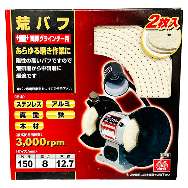 あらゆる磨き作業に適したバフです。剛性が高く、荒研磨から中研磨に最適です。バフ専用研磨剤をつけてご使用ください。外径:150mm厚さ:8.0mm穴径:12.7mm最高使用回転数:3000rpm入数:2枚入使用機種:両頭グラインダー用途:ステンレス・アルミ・真鍮・鉄・木材の磨き作業