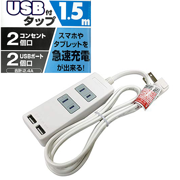 ■USB2.4A 急速充電 USB付 電源タップ 電源コード1.5m 込口防塵シャッター付 星光商事 SK-2T2USBW 送料無料 (北海道・沖縄・離島除く)