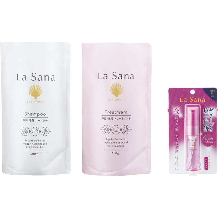 ■ラサーナ 海藻 海泥(どろ)シャンプー(600ml)&トリートメント(600g)+ヘアエッセンス(25ml) 3点セット 空ボトル2点付き