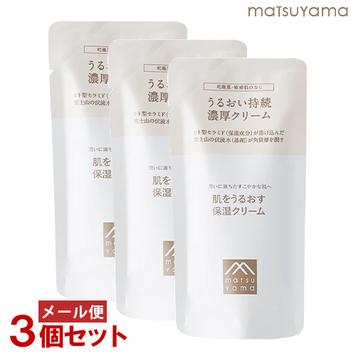 【メール便送料込】※2セット以上ご注文の場合は複数便扱いにさせて頂きます。※他商品同梱不可コクのある濃厚な質感で、肌の潤いを持続させる保湿クリームです。5種類のヒト型セラミドを20%増量し、保湿力を高めて2023年リニューアル。さらに、水分保持量を高める大豆由来成分と、肌をやわらかく保つエモリエント成分スクワランを配合しました。水分の蒸散を防ぎ、しっとりとした潤いを保ちます。アルコール(エタノール)・パラベン・香料・着色料・鉱物油不使用。<こんな方に>・顔全体の乾燥が気になる乾燥肌・敏感肌・季節の変わり目に敏感・コクのあるクリームでしっかり潤いを守りたい肌をうるおす保湿スキンケア/matsuyama[内容量] つめかえ用/45g×3個[メーカー] 松山油脂株式会社[区分] 日本製・スキンケア