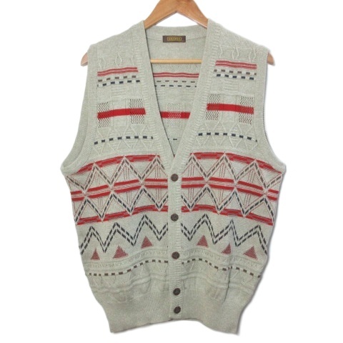 ■【中古】アラミス ARAMIS 美品 ニットベスト ジレ リネン混 前開き 総柄 L ベージュ 赤 /X メンズ