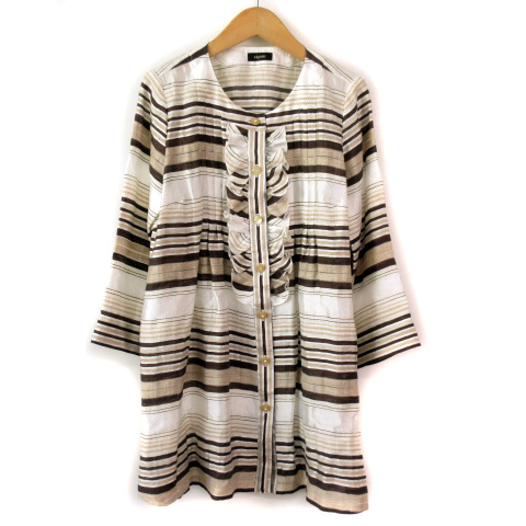 ■【中古】アラミス ARAMIS ブラウス ノーカラー ボーダー フリル リネン 38 白 ホワイト レディース