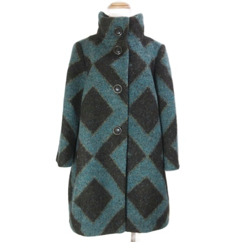 ■【中古】シスレー 美品 コクーンコート 総柄 ウールアルパカ混 9分袖 ミドル丈 TG42 日本サイズM相当 ブルー