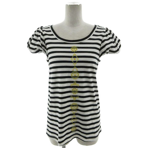 ■【中古】ジルスチュアート JILL STUART カットソー ボートネック 花柄刺繍 半袖 パフスリーブ ボーダー 黒 白 黄色 FR