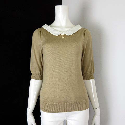 ■【中古】ジルスチュアート JILL STUART ニット トップス 襟付 ピコレース パフスリーブ 5分袖 半袖 M ベージュ オフ白