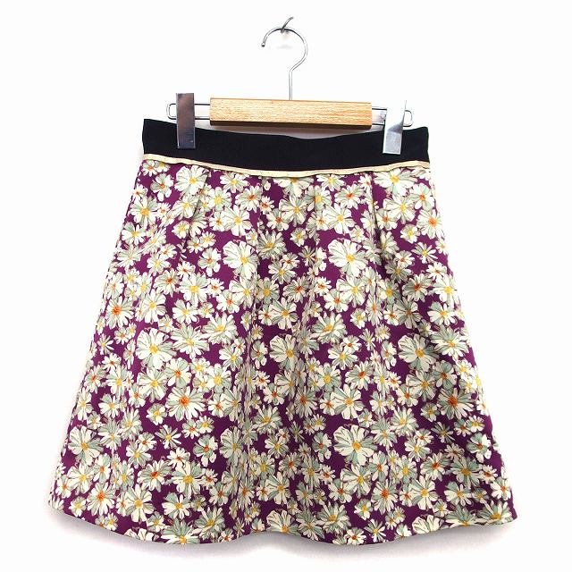 ■【中古】ジルスチュアート JILL STUART フレア スカート ミニ 花 柄 グログランテープ タック 厚手 S パープル 紫