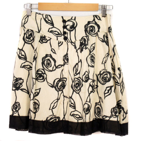 ■【中古】ジルスチュアート JILL STUART スカート フレア ギャザー 花柄 バラ ボーダー シルク 2 アイボリー 黒 ブラック レディース