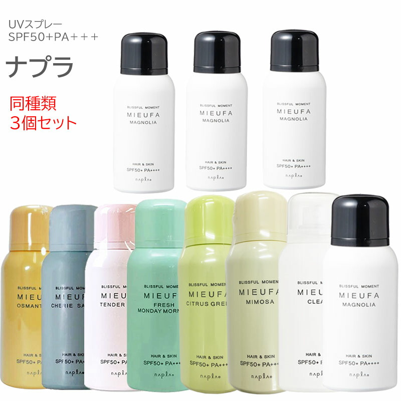 商品名 (同種類3個セット)ナプラ ミーファ フレグランスUVスプレー 80g 選べる 各種 (送料無料) メーカー ナプラ 商品説明 MIEUFA(ミーファ) 気になる日々の紫外線から髪を守る「香る」UVケア。 香りを楽しみながら髪や肌を毎日の紫外線から守る日焼け止めスプレー。 ヘアフレグランスとしても楽しめるマルチなアイテムです。 SPF50+ PA++++でしっかりUVカット。 紫外線や外部の嫌な臭いから髪と肌をしっかり守ります。