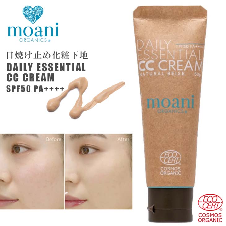moani organics モアニ オーガニクス オーガニック日焼け止め化粧下地 日焼止め デイリーエッセンシャルCCクリーム DAILY ESSENTIAL CC CREAM SPF50 PA++++ UVカット コントロールカラー 美容クリーム 100%天然由来成分 COSMOSORGANIC認証プロダクト 日本正規品 日焼け止め化粧下地 SPF50 PA++++ DAILY ESSENTIAL CC CREAM 1本で、UVカット、コントロールカラー、下地、美容クリームの4役を果たし、紫外線をしっかりとブロックしながら日中の肌を美しく保ちます。 皮脂によるメイク崩れを 防ぎ、色ムラとトーンを均一に整え、くすみを飛ばして*健康的でなめらかな理想の肌に。 100%天然由来成分。肌に負担をかけず石けんで簡単にオフできます。 敏感肌の方も ご使用いただけます。 *メーキャップ効果により ■ 商品詳細 ■ ○COSMOS ORGANIC認証プロダクト ○容量:50g ○カラー:NATURAL BEIGE ○主なオーガニック原料: アロエベラ液汁、ホホバ種子油、ラベンダー油、ローズマ