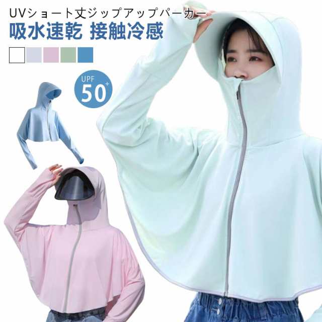 パーカー アウター 手袋 UVカット UPF50+ レディース 速乾 冷感 長袖 ショート丈 バイザー マスク 指穴 UV つば ラッシュガード UVカット 取り外し可能 ポンチョ サンバイザー フード付き 薄手 吸汗 トップス UVケア 紫外線対策 熱中症対策 日焼け防止服 体型カバー