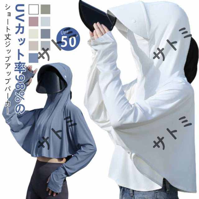 ポンチョ パーカー バイザー UVカット 長袖 ショート丈 冷感 ショート UV UPF50+ ラッシュガード マスク 指穴 手袋 つば サンバイザー レディース 取り外し可能 トップス アウター UVケア 薄手 吸汗 速乾 UVカット 360度紫外線対策 熱中症対策 日焼け防止服 体型カバー