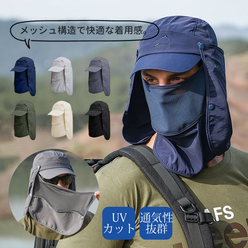 ■UVカット 帽子 メンズ 日焼け止め 紫外線対策 4Way 日除け 取り外し可能 フェイスカバー キャップ 折り畳み アウトドア