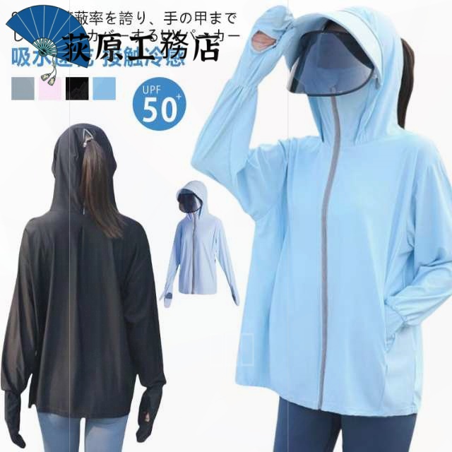 ■体型カバー レディース 吸汗 速乾 フード付き UVケア 指穴 夏 バイザー アウター 紫外線対策 熱中症対策 取り外し可能 薄手 トップス UV