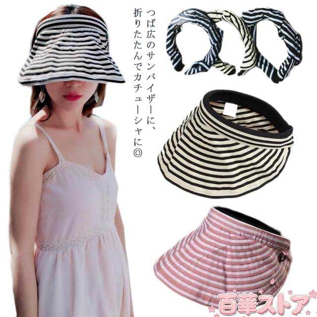 サンバイザー 2WAY 帽子 レディース 折り畳み 折りたたみ カチューシャバイザー つば広 紫外線対策 持ち歩き ポケッタブル 通勤 通学 旅行 UVケア 女性 ボーダー リゾート ゴルフ お出かけ 蒸れにくい おしゃれ 全4色