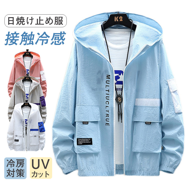■パーカー 日焼け防止服 メンズ 長袖 前開き 日焼け止め アウトドア ポケット付き UV対策 紫外線対策 サンケア おしゃれ 英字