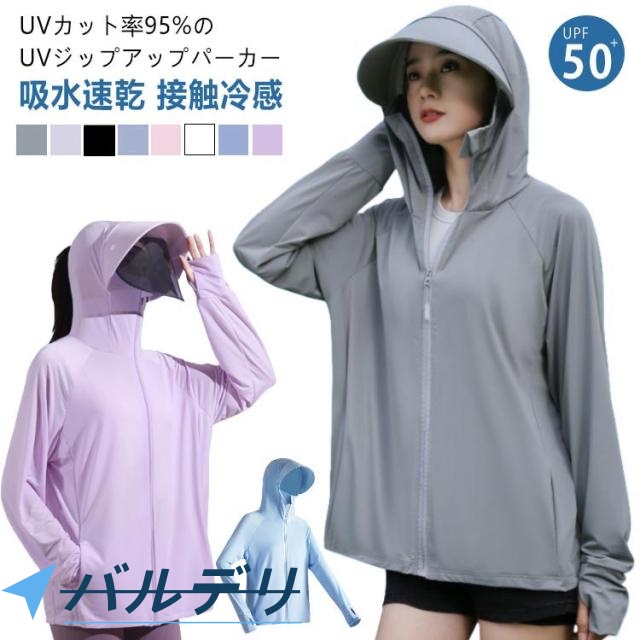 UVカット パーカー UV 冷感 UPF50+ レディース 長袖 ラッシュガード UVカット率95%以上 マスク 指穴 手袋 つば サンバイザー バイザー 取り外し可能 トップス アウター フード付き 薄手 吸汗 速乾 UVケア 360度 紫外線対策 熱中症対策 日焼け防止服 体型カバー 夏