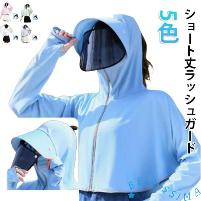 長袖 フード付き 取り外し可能 UVカット ショート丈 UV 体型カバー UVカット バイザー つば ラッシュガード パーカー 指穴 ショート ポンチョ 手袋 サンバイザー レディース トップス アウター 冷感 薄手 吸汗 速乾 UVケア 紫外線対策 熱中症対策 日焼け防止服