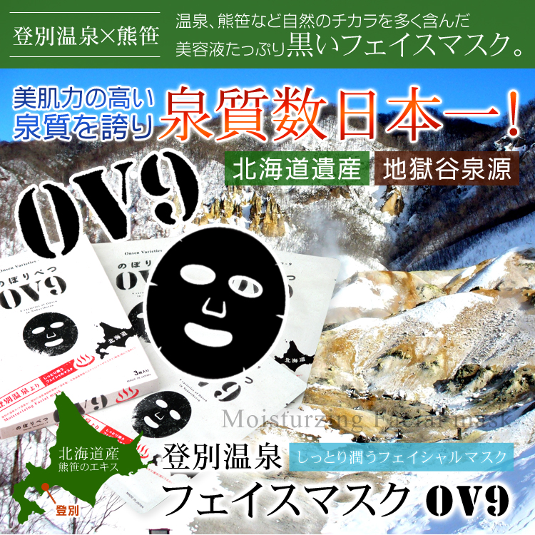 OV9フェイスマスク 1箱3枚入り 登別温泉水使用 北海道 登別温泉 は、自然湧出量 1日1万トン、源泉温度45℃〜90℃の高温。 硫黄泉・酸性鉄泉 など9種類ものバラエティ豊かな 泉質 が魅力です。 世界的にも珍しく「温泉のデパート」と呼ばれています。 そんな登別温泉の特長から「OV9」Onsen Varieties-9 と名付けしました。 泉源の 北海道自然遺産 「地獄谷」から温泉水として 硫黄泉 、温泉凍結乾燥物 として 酸性鉄泉 をセレクト・配合したお肌のためのスキンケア化粧品です。 【3つのこだわり成分】 ・登別温泉 の 温泉水 :お肌に潤いをあたえ、湯上り 美肌 へ整えます。 ・北海道産 クマザサエキス : 抗酸化作用 と 保湿効果 でダメージに強い肌へ。 ・北海道産 キトサン :ズワイガニの甲羅から抽出。お肌をやわらかく、しっとりと保ちます。 【ご使用方法】 ・マスクを袋から取り出します。 ・顔の形に合わせて、マスクを全体にフィットさせてください。 ・5〜10分程度密着させてから、マスクを?がし、お肌によくなじませます。