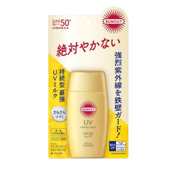 ●SUNCUT サンカット パーフェクトUV ミルク●SPF50+ PA++++(UV耐水性★★)●汗、水、こすれ、動きに強く抜群に落ちにくい。●スーパーストレッチ処方でUVカット効果が長く続く。●嬉しいスキンケア効果も。●コラーゲン、ヒアルロン酸、モイストリペアCPX配合。(全て保湿)●アレルガード機能搭載。●花粉、ちり、ほこり、PM2.5などの微粒子もブロック。●石けんで落とせる。●無香料、無着色、無鉱物油、パラベンフリー。●紫外線鉄壁ガードのミルクタイプ。●顔・からだ用。●スーパーウォータープルーフ。●化粧下地としても。●販売名:サンカット パーフェクトUV ミルク N〈日やけ止め乳液〉