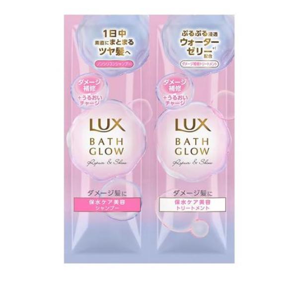 ●LUX BATH GLOW Repair & Shine ラックス バスグロウ リペアアンドシャイン シャンプー&トリートメント サシェセット●ダメージ髪に「ダメージ補修+うるおいチャージ」保水ケア美容ヘアシャンプー&トリートメントの1回分お試しサイズ(各10g)●朝、髪がまとまらない原因の1つは髪の水分不足。保水ケア美容で朝起きてから1日中素直にまとまるツヤ髪へ。●ダメージが気になる方におすすめな、リペア&シャイン。傷んで乱れた髪を内部まで補修。光を反射する自然なツヤ髪へ導きます。●髪内部にとどまる、ぷるぷる浸透ウォーターゼリー(*1)配合。◇スイゼンジノリエキス:ヒアルロン酸の約5倍(*2)の保水力を持つ保湿成分。◇グリセリン水溶液:髪の芯まで浸透し、保湿。◇アルギニン:髪のダメージを集中補修・保湿。●水溶性コラーゲンアミノ(*3)配合。ダメージによる髪内部の乾燥をケア。●ホワイトフリージア&グリーンアップルのみずみずしく清楚な香り。●パラベン・合成着色料・シリコン無添加。●ノンシリコンシャンプー/ヘアケア/ダメージケア●販売名:ラックスPPRシャンプーB〈1回分〉10g●販売名