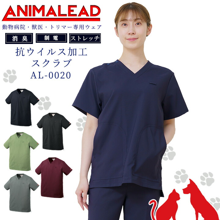 ■アニマリード スクラブ 動物病院 獣医 トリマー 抗ウイルス加工 制菌 男女兼用 AL-0020 ANIMALEAD 医療白衣 ドクター 犬 猫【専用ウェア
