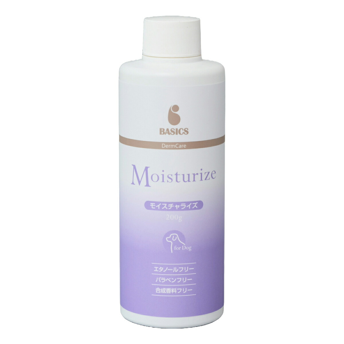 BASICS スキンケア Derm Care モイスチャライズ 持続して潤いを閉じ込める洗い流し不要の保湿ローション。皮膚をやさしくケアして健康を保つ低刺激の保湿剤。皮膚科学の先端技術であるフラーレン、ジラウロイルグルタミン酸リシンNa、ポリクオタニウム-51の持続性高保湿成分をリッチ配合。複合セラミド※、フィトスフィンゴシンで潤いキープ(※ユズセラミド、セラミドNP、セラミドNG、セラミドAP、セラミドEOP)。愛犬の安全を考慮したエタノール・フリー、パラベン・フリー、合成香料・フリー