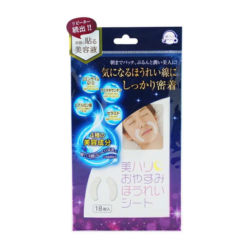JAN 4580215004483 【商品説明】 年齢と共にほうれい線は深くなります。 このシートを気になるほうれい線に沿って貼って寝るだけ。 翌朝はがすと、ほうれい線がスッキリします。 アスタキサンチン、コエンザイムQ10、セラミド、ヒアルロン酸と、ほうれい線に特化した成分を配合しています。 【使用方法】 寝る前に気になるほうれい線に沿ってシートを貼って、翌朝はがすだけでスッキリします。 加齢と共にブルドッグのように垂れ下がるほうれい線に、シートの粘着で奥まで広げてクセづけしながら美容成分が一晩中働きかけます。 【内容量】 18枚入り 【サイズ(約)】 縦6.4 × 横1.7cm(1枚あたり) 【成分】 スクワラン、水添(スチレン/ブタジエン)コポリマー、オリーブ果実油、水添ポリ(C6-14オレフィン)、(スチレン/イソプレン)コポリマー、トリ(カプリル酸/カプリン酸)グリセリル、ヘマトコッカスプルビアリスエキス、アスタキサンチン、トコフェロール、ヒアルロン酸Na、セラミドNP、ユビキノン