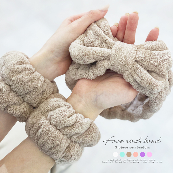 \ふわモコ素材のウォッシュバンド3点セット/ リストバンドは洗顔時に袖口が濡れたり、 床が濡れるのを防ぐ便利アイテム! 吸水力に優れた素材で、水滴を瞬時に吸収します。 同素材のヘアバンドもふわふわで気持ちいい◎ また、洗顔時だけでなく食器洗い時にもおススメ! 水洗いができるのでいつも清潔に保てます。 ※洗濯機を使用する場合はネットに入れて選択してください。 ※色の濃い衣類と選択すると色移りする可能性がございます。 他のものと分けて選択することをお勧めします。