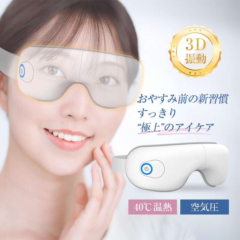 【本格的な指圧マッサージ】 エアバッグ機能は、空気の力で圧を加えて刺激し、目元とこめかみをバランスよくケアしてくれます。指圧マッサージのように人に揉まれているような感覚と心地よさを感じられます。目の周りの筋肉にアプローチし、癒された感覚を得られるため、目元をリフレッシュできます。 【40℃温熱で目元温活】 温熱機能も搭載しており、40℃前後の熱でしっかりと目元を温め、疲れを癒やしてくれます。 眼精疲労の悩みにも効果的です。短い時間の使用で目元がスッキリするので、酷使した目をじんわりと温め、リラックスさせましょう。 【新感覚の3D振動】 皮膚が薄く、刺激を受けやすい目元に振動で心地よい刺激を。 適度で優しい振動により目元周辺をしっかりケアしてくれます。 【5つのモード】 1.自動モード:エアマッサージ+温湿布+振動マッサージ 2.アイケアモード:エアマッサージ+温湿布 3.バイタリティモード:エアマッサージ+振動マッサージ 4.コンフォートモード:温湿布 5.スリープモード:エアマッサージ