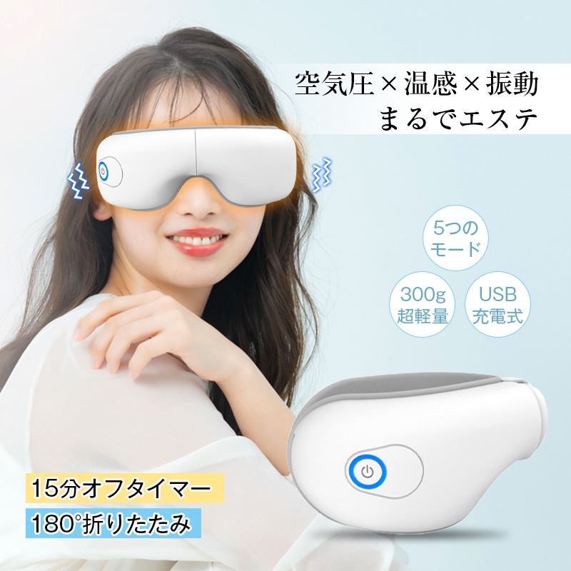 【本格的な指圧マッサージ】エアバッグ機能は、空気の力で圧を加えて刺激し、目元とこめかみをバランスよくケアしてくれます。指圧マッサージのように人に揉まれているような感覚と心地よさを感じられます。目の周りの筋肉にアプローチし、癒された感覚を得られるため、目元をリフレッシュできます。【40℃温熱で目元温活】温熱機能も搭載しており、40℃前後の熱でしっかりと目元を温め、疲れを癒やしてくれます。眼精疲労の悩みにも効果的です。短い時間の使用で目元がスッキリするので、休憩時間に使うのもおすすめ。酷使した目をじんわりと温め、リラックスさせましょう。【新感覚の3D振動】皮膚が薄く、刺激を受けやすい目元に振動で心地よい刺激を。適度で優しい振動により目元周辺をしっかりケアしてくれます。まるでプロの施術を受けているような気持ちよさ!スッキリ感を得られます。