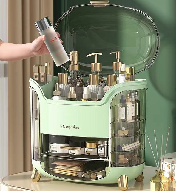 【たっぷり収納力】コスメボックスは大容量収納設計で高さ21cmのスキンケアからリップなど細小な物までたっぷり収納できます。一目瞭然で使用しやすいです。【仕切りが充実しています】メイク収納ケースは仕切りが付いて、それぞれのアイテムごとに分類してすっきり収納しています。必要なものがさっと取り出せます。朝の時間はかなり忙しいので、これがあれば助かります。【クリアカバー付き】化粧ボックスは蓋付きで、ホコリやウイルスから化粧品を守ります。サッと拭くだけで汚れがキレイに落ちます。洗面所に置いても使用可能!クリアカバー設計で化粧箱中身をよく見え、ショーケースにもなります。【こだわりデザイン】スキンケア収納できるスペース、リップなど細長いメイク道具立て、両側の各段ごとに開閉できる小物入れ、メイクマスク収納しやすい引き出しのデザインでメイク全般収納できます。【おしゃれ】インテリアに馴染みやすいホワイトとグリーン2色ご用意できます。高級感のあるゴールドの引手と脚を採用でオシャレ感も溢れております。